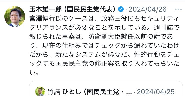 そう投稿したのは、映像ディレクターで経済メディア「ReHacQ」プロデューサーの高橋弘樹氏だ。衆議院選直後の10月30日、玉木氏が東京・新宿のバーで不倫相手の39歳元グラドル女性・小泉みゆきと密会していたことを、本誌が写真とともに報じている。