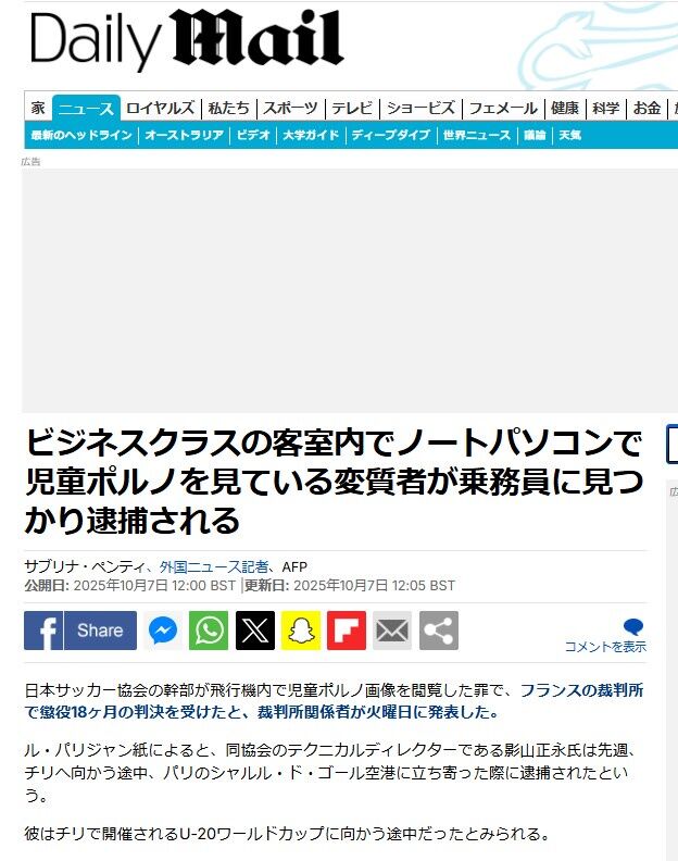現地メディアは「日本サッカー協会の幹部で元プロ選手は、児童ポルノ画像の輸入・所持の容疑で、パリ近郊ボビニーの簡易裁判所で今月月曜日に審理を受けた」と報道。「58歳の同氏は日本サッカー協会のテクニカルディレクターを務め、20代以下の代表チームのU―20W杯に向かう途中でチリへ出張する際、10月2日にフランスの現地空港で飛行機を降りた際に逮捕された」と説明。